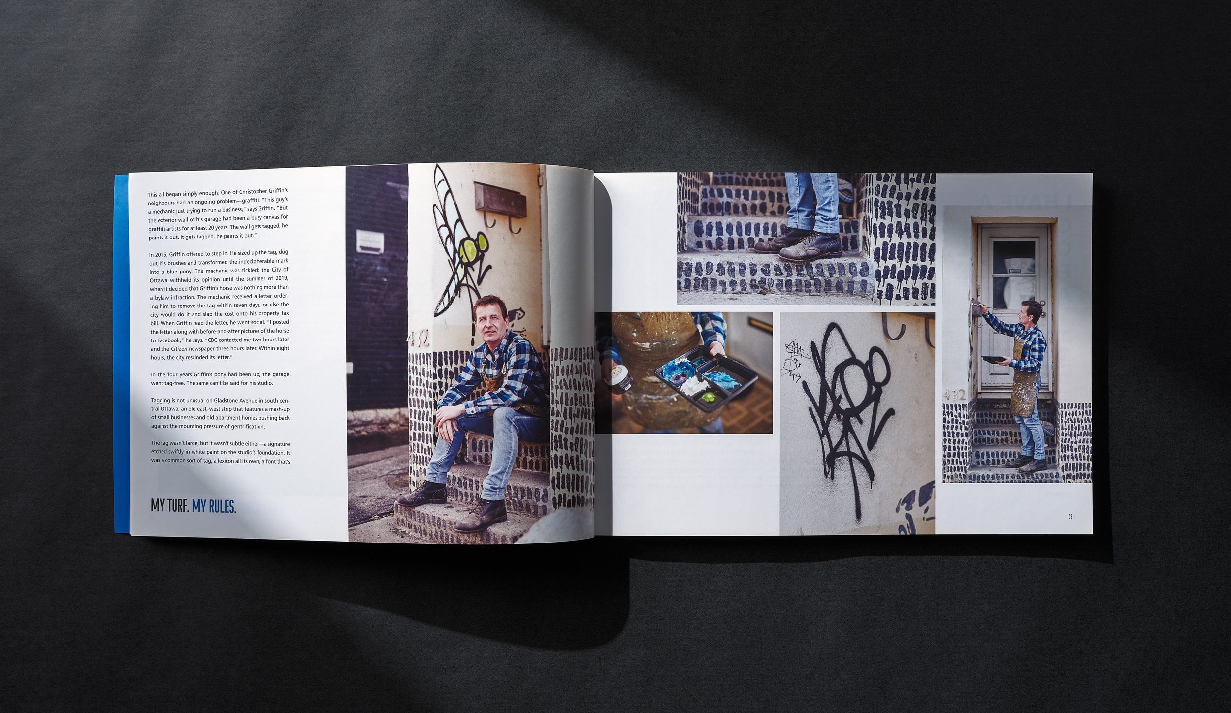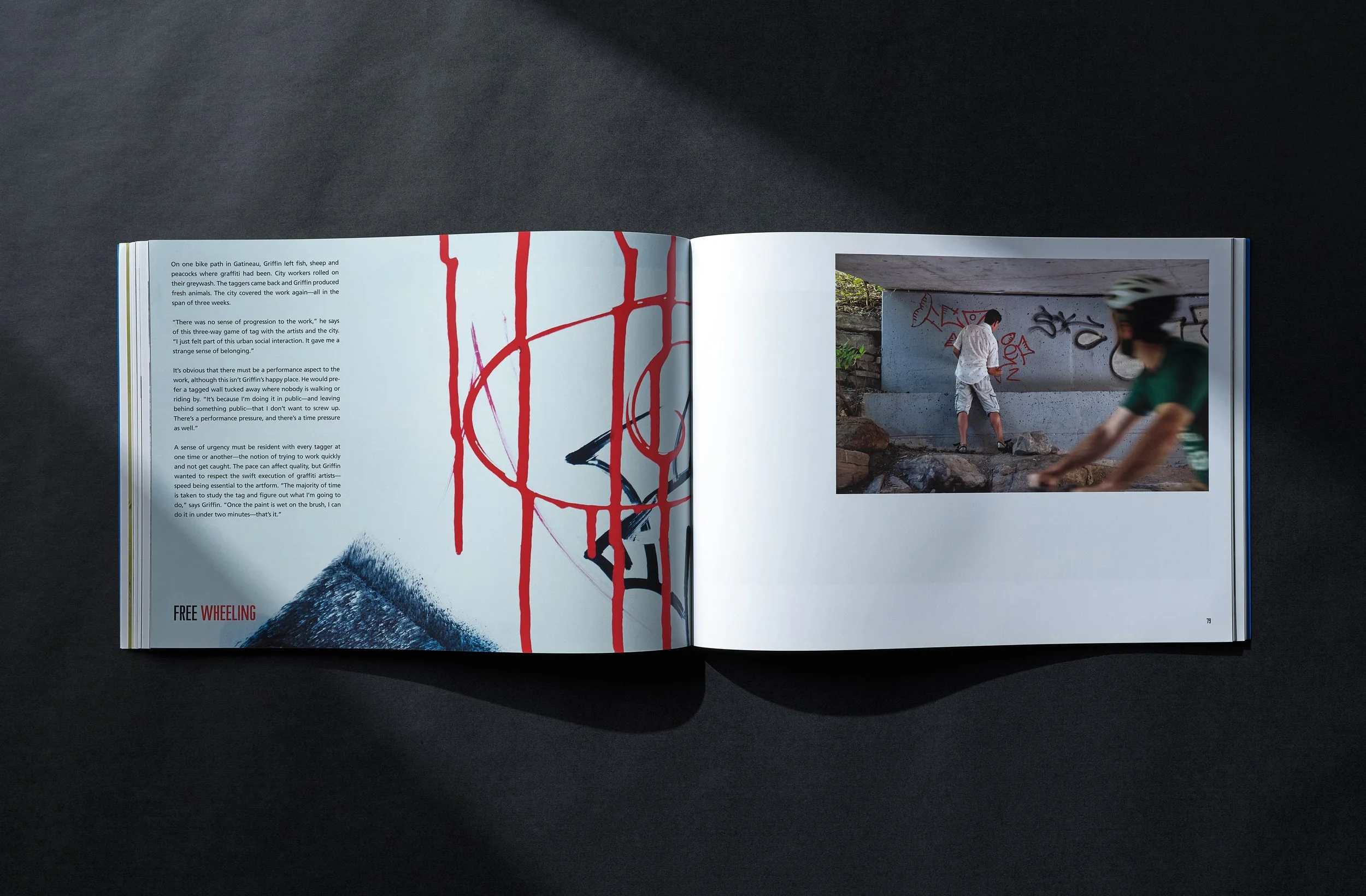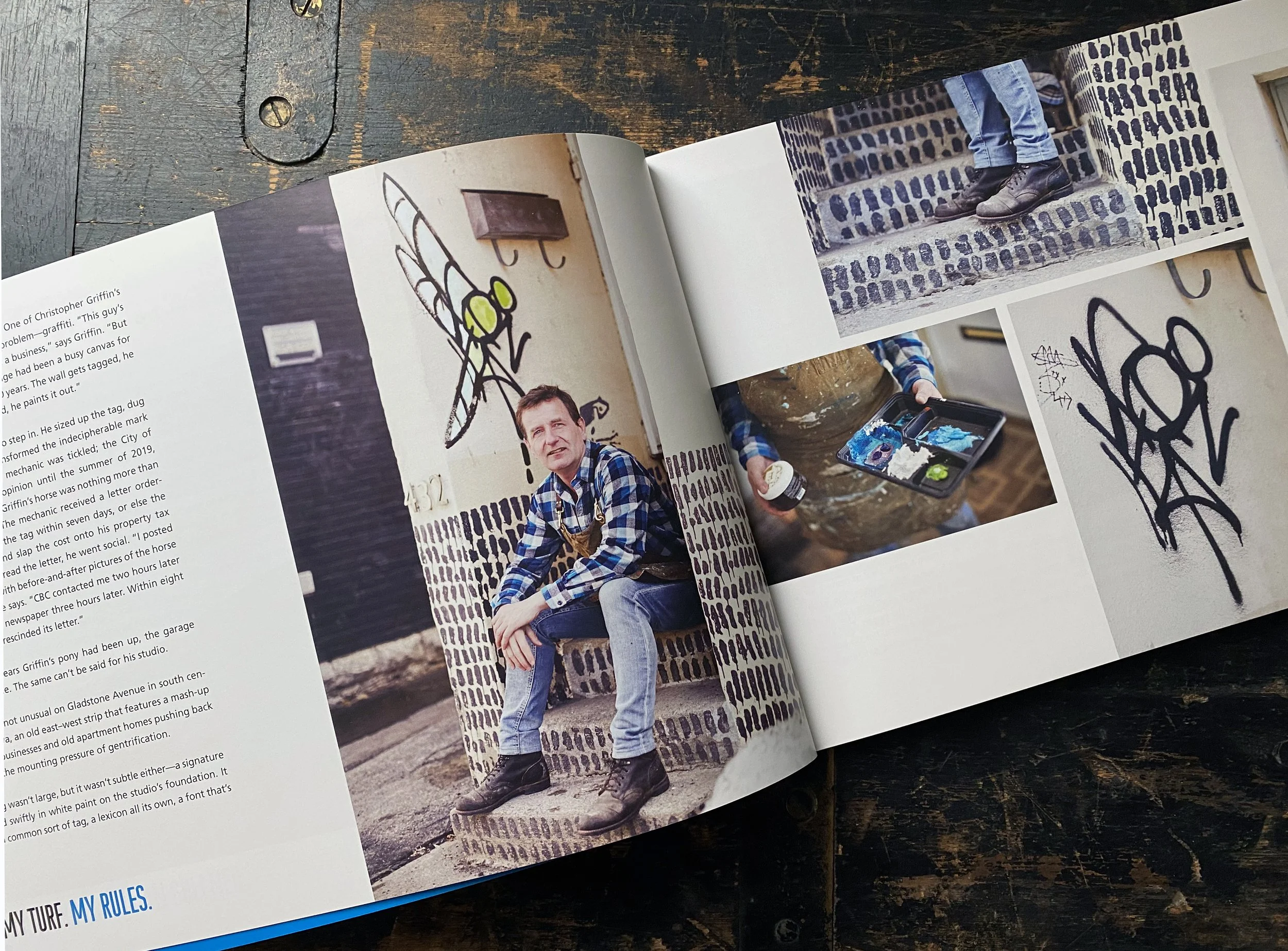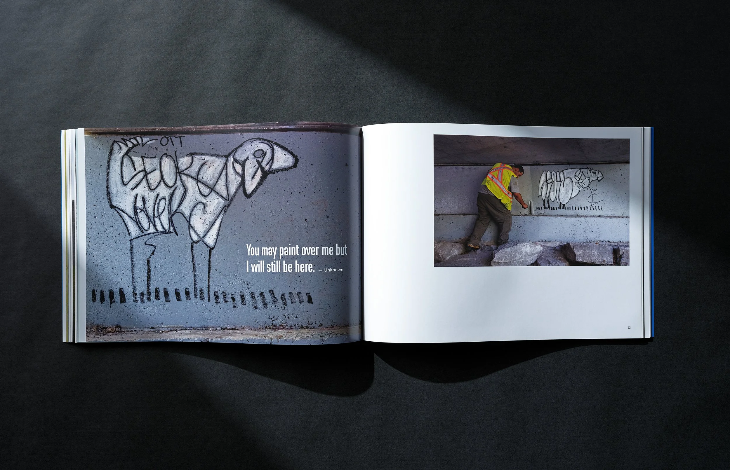 This 130-page book documents artist Christopher Griffin’s eight-month graffiti project in Spain and the Ottawa-Gatineau area. Griffin set out to enhance simple graffiti tags and eventually worked on large-scale highway underpasses, creating herds of animals where city workers had covered previous graffiti with ugly grey patches. Griffin hopes this project will open the door to a new form of collaboration in dealing with urban graffiti problems. For this project, Domino provided overall creative direction, including book layout and design, team coordination and print supervision.